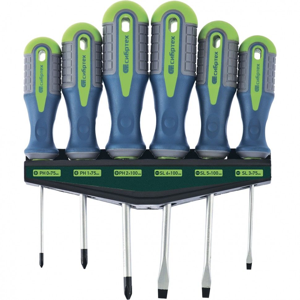Набор отверток Сибртех 13374 включает в себя 6 предметов из стали CrV с трехкомпонентными рукоятками, которые будут полезны мастерам при осуществлении несложных ремонтных и монтажных работ. С их помощью можно производить монтаж/демонтаж резьбового крепежа с профилем SL и PH. Длина стержней отверток составляет 75-100 мм для удобства работы с крепежом на поверхностях и в небольших углублениях. ПреимуществаДолговечность и надежность — стержни выполнены из прочной хромованадиевой стали, рабочие части закалены до твердости 50-52 HRC. Антикоррозионная стойкость — металлические части имеют хромовое покрытие, а кончики отверток фосфатированы. Универсальность — набор включает отвертки самых распространенных размеров: PH0, PH1, PH2, SL3, SL5, SL6. Компактное хранение — набор поставляется на подвесной пластиковой полке, а рукоятки имеют специальные отверстия.