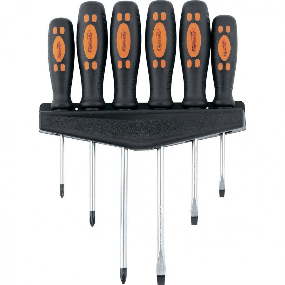 Набор Sparta 13307 состоит из 6 отверток и незаменим для работы с резьбовым крепежом. Отвертки с разными шлицами наиболее востребованных размеров позволяют эффективно решать большинство поставленных задач. Набор будет полезен дома, на даче и в гараже. ПреимуществаНадежность — стержни изготовлены из прочной хромованадиевой стали, твердость рабочих частей составляет 46 HRC. Комфортная работа — намагниченные наконечники надежно фиксируются в головке крепежа. Эргономичность — двухкомпонентные рукоятки с нескользящей поверхностью удобно ложатся в руку. Удобное хранение — набор поставляется с подвесной полкой, поэтому отвертки всегда будут под рукой.
