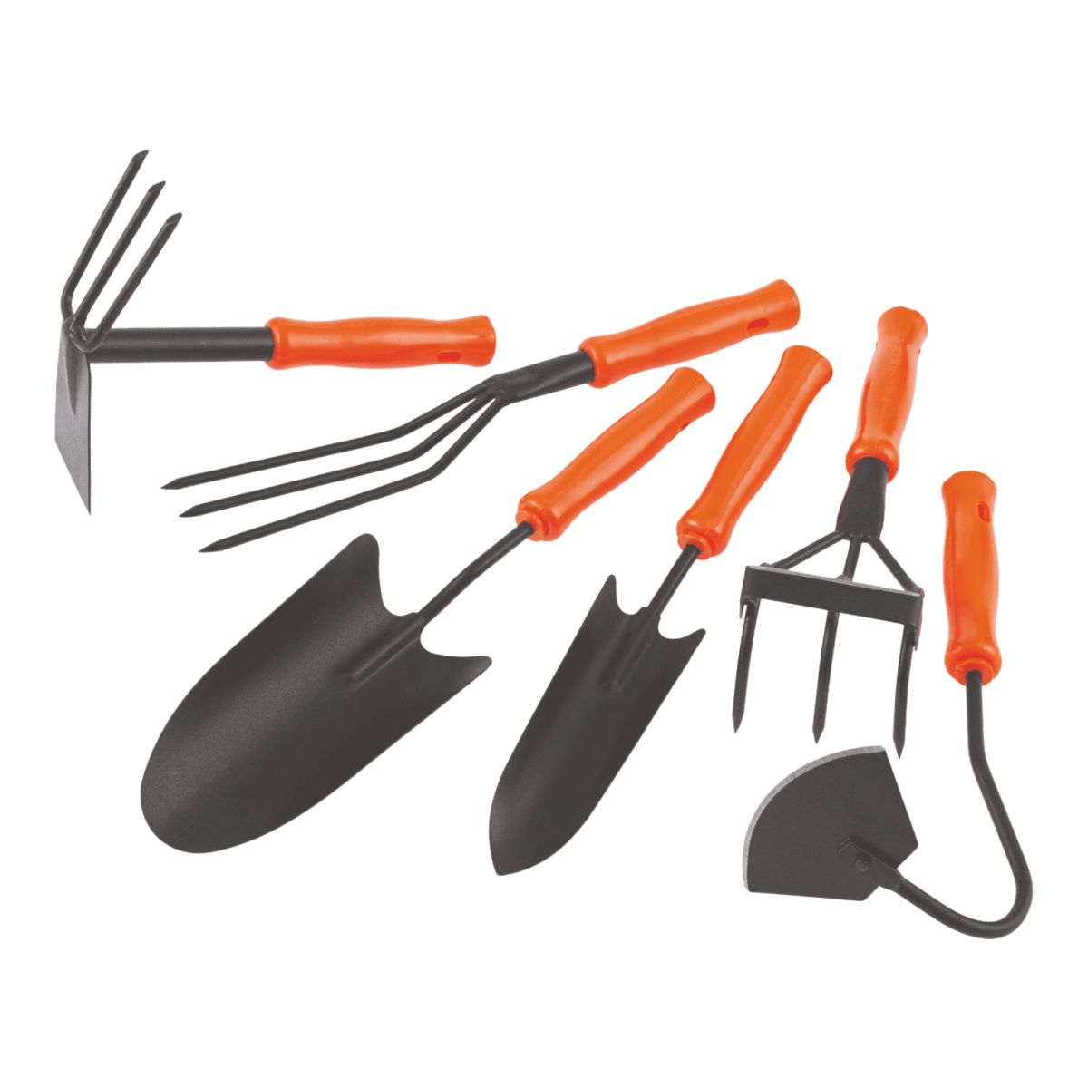 Набор садового инструмента Palisad 629127 с пластиковыми рукоятками состоит из 6 предметов: универсальной и радиусной мотыжек, комбинированного рыхлителя, узкого и широкого совков, вилки. При помощи инструментов можно вскапывать, полоть землю, формировать бороздки и лунки, сажать растения. Компактные инструменты удобны для работы на небольших клумбах и грядках. ПреимуществаНадежность — рабочие части изготовлены из углеродистой стали. Долговечность — порошковая эмаль защищает инструменты от коррозии. Удобное хранение и транспортировка — набор упакован в картонную коробку.