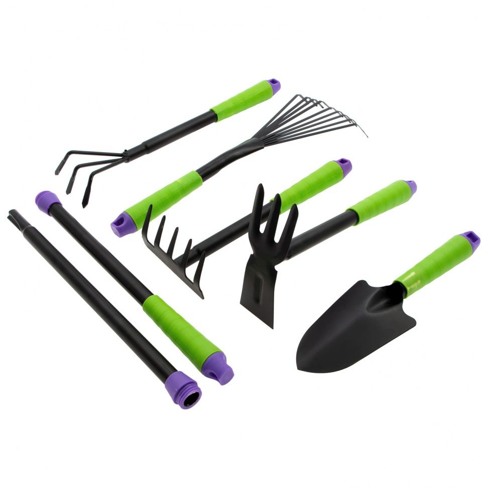 Набор Palisad CONNECT 63020 включает 7 предметов — садовые инструменты с пластиковыми рукоятками для вскапывания, прополки и рыхления почвы, а также сбора листвы и мусора. У каждого инструмента имеется ручка со съемным колпачком, которую можно удлинить при помощи входящих в комплект штанги и рукоятки, подобрав оптимальный для своего роста размер. Набор будет полезен во время работы на дачном участке. ПреимуществаПрочность и долговечность — элементы набора изготовлены из среднеуглеродистой стали и покрыты порошковой эмалью, предотвращающей образование коррозии. Качественная аэрация — рыхлитель и классические грабли с заостренными зубьями легко проникают в почву. Удобное вскапывание и рыхление почвы в труднодоступных местах — полотно мотыжки совмещено с рыхлителем. Эффективная уборка — веерными граблями с плоскими зубьями удобно сгребать листву и мелкий садовый мусор. Комфортная работа — рифленые рукоятки не выскальзывают из рук. Удобное хранение — в рукоятках имеются отверстия для подвешивания инструментов.