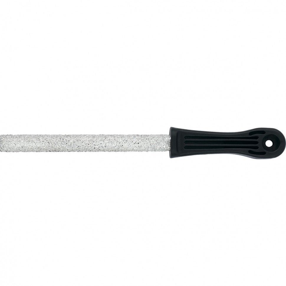 Круглый напильник Matrix 16504 с карбидным напылением, с рабочей частью длиной 150 мм и диаметром 4 мм, предназначен для зачистки и доводки изделий из материалов повышенной твердости: металла или керамики. Оптимален для опиливания округлых выемок и отверстий. Будет полезен в слесарной мастерской, во время ремонта, а также пригодится в быту. ПреимуществаПрочность и устойчивость к нагрузкам — полотно выполнено из закаленной стали. Высокие абразивные свойства — на рабочую часть нанесено карбидное напыление. Комфортная работа — пластиковая рукоятка с покрытием из мягкого эластомера не выскальзывает из ладони. Удобное хранение — в рукоятке имеется отверстие для подвешивания инструмента.