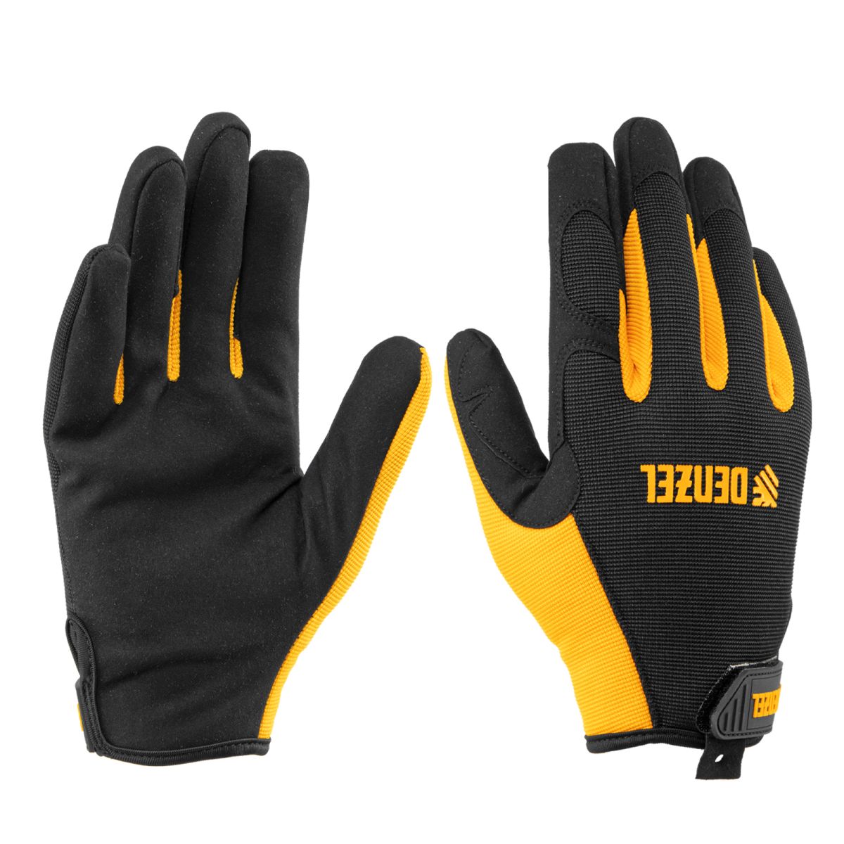 Универсальные перчатки Denzel 67993 размера 9, с манжетами на «липучке», используются для работы со слесарным инструментом. Надежно защищают кожу рук от царапин и мозолей. Пригодятся в мастерской, дома или в гараже. ПреимуществаИзносостойкость — перчатки устойчивы к истиранию благодаря прочному материалу (сочетание полиэстера, спандекса, полиамида, нейлона, полиуретана и поливинилхлорида). Плотная посадка — манжеты на «липучках» обеспечивают надежную фиксацию. Комфортная эксплуатация — перчатки анатомического кроя плотно облегают кисти рук и не стесняют движения пальцев.