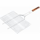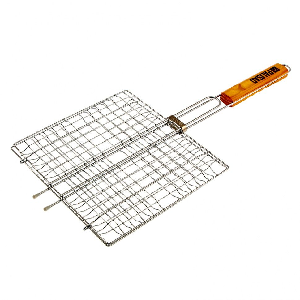 Хромированная решетка гриль Palisad Camping 69555 размером 270 х 240 мм предоставляет возможность приготовления на углях продуктов, которые трудно наколоть на шампур. Она будет полезна любителям отдыха на открытом воздухе для жарки стейков, рыбы, овощей и т. д. ПреимуществаГарантией качества и долговечности решетки выступает жаропрочная сталь, из которой она выполнена. Хромированная решетка устойчива к коррозии, поэтому на ней не образуется ржавчина. Благодаря широкому кольцу-фиксатору части решетки не раскрываются в процессе эксплуатации, поэтому еда не выпадет. Деревянная рукоятка оснащена подпальцевыми выемками для удобного захвата. Решетка оборудована увеличенными опорными стержнями, за счет чего прочно фиксируется на мангале, а при готовке ее площадь используется полностью.
