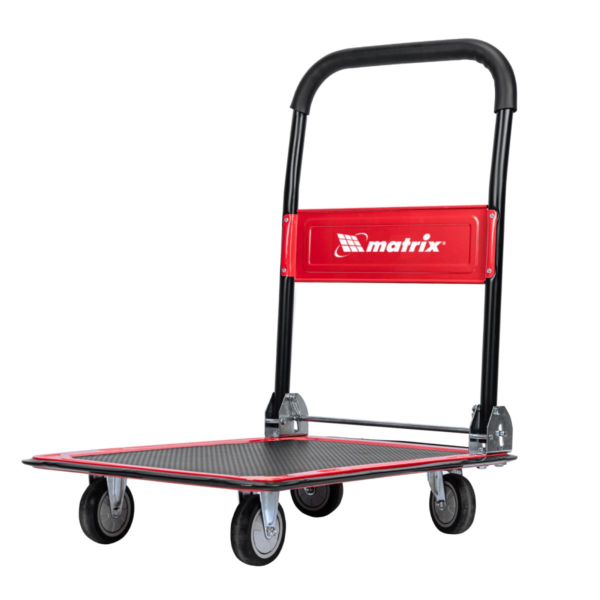 Хозяйственная тележка Matrix 98211 предназначена для перемещения грузов массой до 150 кг. На платформе размером 730 x 475 мм можно разместить даже крупногабаритные предметы. ПреимуществаПродуманная конструкция — противоскользящее покрытие платформы препятствует смещению груза во время транспортировки. Прочность — стальная рама выдерживает высокие нагрузки без риска деформации. Комфортная эксплуатация — рукоятка с накладкой из вспененного полипропилена обеспечивает удобный захват. Компактность — благодаря складной платформе тележка не занимает много места во время хранения и транспортировки.