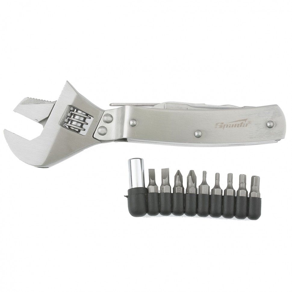 Трансформер Sparta 176065 длиной 170 мм включает в себя 8 предметов и позволяет успешно решать самые разные задачи. Ножом можно разрезать веревку или картон, напильником — заточить рыболовный крючок. Многофункциональный набор включает также разводной ключ, пассатижи и биты, необходимые для выполнения слесарных работ. Его можно использовать дома, на даче, в гараже, а также в походе, на охоте или рыбалке. ПреимуществаПрочность и долговечность — инструмент изготовлен из стали. Удобное хранение и транспортировка — трансформер поставляется с чехлом на молнии. Компактность — трансформер длиной 17 см помещается в сумку или рюкзак.