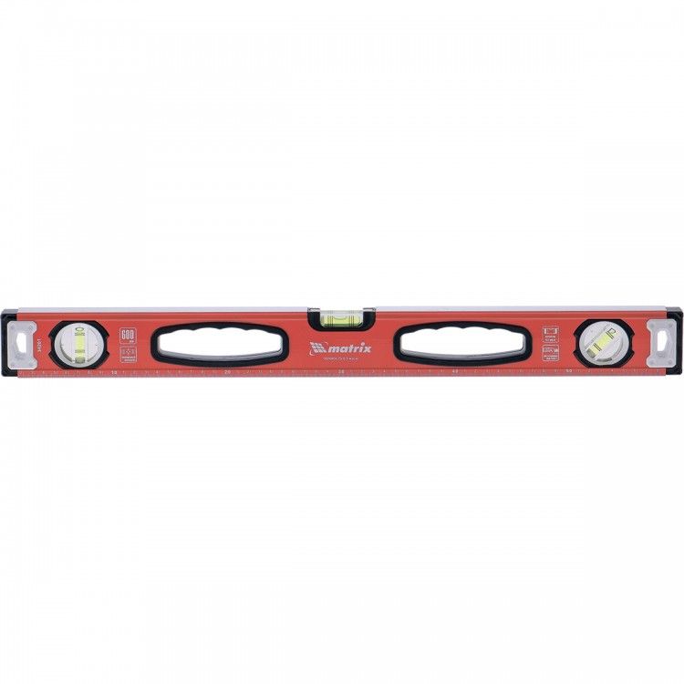 Алюминиевый фрезерованный уровень Matrix 34202 длиной 800 мм, с 3 глазками и рукоятками, позволяет обнаружить отклонения от вертикали и горизонтали, а также выставить диагональ. Инструмент будет полезен на строительной площадке, при выполнении ремонтных и монтажных работ. ПреимуществаНадежность — уровень изготовлен из алюминиевого профиля, колбы установлены с использованием электронной калибровки. Высокая точность выполняемых работ — рабочая поверхность фрезерована для снижения погрешности измерений. Эргономичность — благодаря отверстиям в корпусе инструмент удобно удерживать. Использование в качестве линейки — на корпус нанесена измерительная шкала. Для определения отклонения вертикали 90° необходимо использовать пузырьковую ампулу только в верхнем положении уровня. Только базовая поверхность (противоположная ампуле 180°) является рабочей.