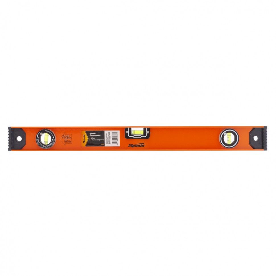 Уровень алюминиевый Sparta «Рельс» 34046 длиной 600 мм имеет 3 глазка, 1 из которых поворотный. С помощью инструмента удобно определять наличие отклонений от горизонтали и вертикали, а также выставлять произвольный угол. ПреимуществаПрочность — корпус выполнен из двутаврового алюминиевого профиля. Защита корпуса — торцевые заглушки повышают ударопрочность и предотвращают попадание внутрь пыли и мелкого мусора. Удобный захват — в корпусе имеется 2 отверстия. Точные результаты — погрешность составляет всего 1 мм/м (0,057°). Дополнительные возможности — измерительная шкала позволяет использовать уровень в качестве линейки. Для определения отклонения вертикали 90° необходимо использовать пузырьковую ампулу только в верхнем положении уровня. Только базовая поверхность (противоположная ампуле 180°) является рабочей.